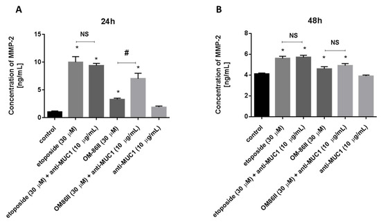 The concentration of MMP-2 in human gastric cancer AGS cells after 24 h (A) and 48 h (B) of incubation with anti-MUC1 (10 μg/mL), OM-86II (30 μM), OM-86II + anti-MUC1 (30 μM + 10 μg/mL), etoposide (30 μM) and etoposide + anti-MUC1 (30 μM + 10 μg/mL). Data are presented in ng/mL. * p < 0.05 vs. control group; # p < 0.05. MUC1, mucin-1; OM-86II, octahydropyrazin[2,1-a:5,4-a′]diisoquinoline derivative; NS, not significant.