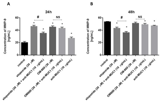 The concentration of MMP-9 in human gastric cancer AGS cells after 24 h (A) and 48 h (B) of incubation with anti-MUC1 (10 μg/mL), OM-86II (30 μM), OM-86II + anti-MUC1 (30 μM + 10 μg/mL), etoposide (30 μM) and etoposide + anti-MUC1 (30 μM + 10 μg/mL). Data are presented in ng/mL. * p < 0.05 vs. control group; # p < 0.05. MUC1, mucin-1; OM-86II, octahydropyrazin[2,1-a:5,4-a′]diisoquinoline derivative; NS, not significant.
