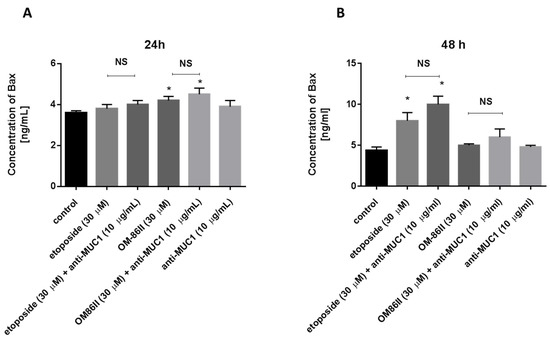 The concentration of pro-apoptotic Bax in human gastric cancer AGS cells after 24 h (A) and 48 h (B) of incubation with anti-MUC1 (10 μg/mL), OM-86II (30 μM), OM-86II + anti-MUC1 (30 μM + 10 μg/mL), etoposide (30 μM) and etoposide + anti-MUC1 (30 μM + 10 μg/mL). Data are presented in ng/mL. * p < 0.05 vs. control group; MUC1, mucin-1; OM-86II, octahydropyrazin[2,1-a:5,4-a′]diisoquinoline derivative; NS, not significant.