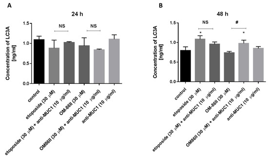 The concentration of LC3A in human gastric cancer AGS cells after 24 h (A) and 48 h (B) of incubation with anti-MUC1 (10 μg/mL), OM-86II (30 μM), OM-86II + anti-MUC1 (30 μM + 10 μg/mL), etoposide (30 μM) and etoposide + anti-MUC1 (30 μM + 10 μg/mL). Data are presented in ng/mL. * p < 0.05 vs. control group; # p < 0.05. MUC1, mucin-1; OM-86II, octahydropyrazin[2,1-a:5,4-a′]diisoquinoline derivative; NS, not significant.