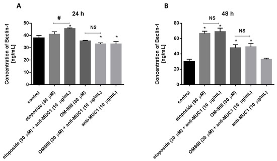 We checked the Beclin-1 concentration after 24 and 48 h of incubation with the analyzed compounds (Figure 14). We proved that longer exposition of cells to the combination of compounds (etoposide + anti-MUC1, OM-86II + anti-MUC1) led to the increase of the Beclin-1 concentration. The concentrations of Beclin-1 were 68.86 ng/mL for etoposide with the anti-MUC1 antibody and 49.2 ng/mL for OM-86II with the anti-MUC1 antibody after 48 h of incubation, in comparison with untreated cells (30 ng/mL).