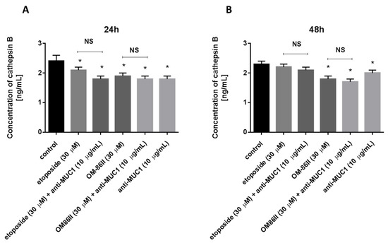 The concentration of cathepsin B in human gastric cancer AGS cells after 24 h (A) and 48 h (B) of incubation with anti-MUC1 (10 μg/mL), OM-86II (30 μM), OM-86II + anti-MUC1 (30 μM + 10 μg/mL), etoposide (30 μM) and etoposide + anti-MUC1 (30 μM + 10 μg/mL). Data are presented in ng/mL. * p < 0.05 vs. control group; MUC1, mucin-1; OM-86II, octahydropyrazin[2,1-a:5,4-a′]diisoquinoline derivative; NS, not significant.