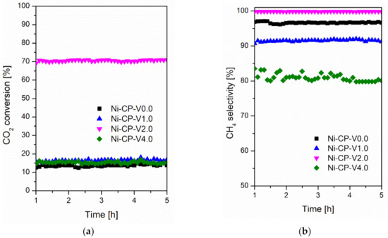 Steady-state tests were carried out at 300 °C for 5 h for all studied catalyst at the same operating conditions and presented in Figure 2. A similar trend in activity at 300 °C was observed when compared to that recorded during the TPSR test. The conversions for Ni-CP-V0.0, Ni-CP-V1.0, Ni-CP-V2.0, and Ni-CP-V4.0 were slightly higher (ca. 10%) and stable during the entire 5 h test. The CH4 selectivity was found to be stable and higher than 91% for both Ni-CP-V0.0 and Ni-CP-V1.0. However, the methane selectivity for Ni-CP-V4.0 decreased from 84 to 79%, showing a possible negative impact of high V loading, which is favorable for CO production [33]. Finally, Ni-CP-V2.0 showed high conversion and high methane selectivity during time on stream.