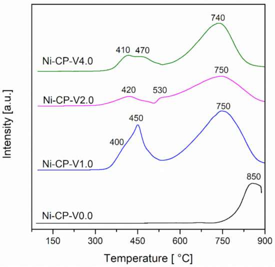 This peak can be assigned to the reduction of the nickel present in the periclase-like mixed-oxide structure. This typical reaction temperature peak at ca. 850 °C corresponds to the reduction of ca. 20 wt% of nickel in the Ni/Mg/Al matrix [11,34]. This later peak is shifted to lower temperatures, with the increase of vanadium content, with a maximum at 740 °C for Ni-CP-V4.0. This shift can be explained by the weakening of the interaction between nickel and the oxide matrix, under the influence of vanadium. In our previous study, the reduction of impregnated V from Mg-Al hydrotalcite-derived oxide matrix was investigated (Figure S1). The collected profiles showed a narrow peak at 590–610 °C, corresponding to the reduction of vanadium from V5+ to V4+ [35]. Since V5+ is reduced in the temperature range of the measurement, it is possible to assume that it ungergoes simulateous reduction with nickel [36].
