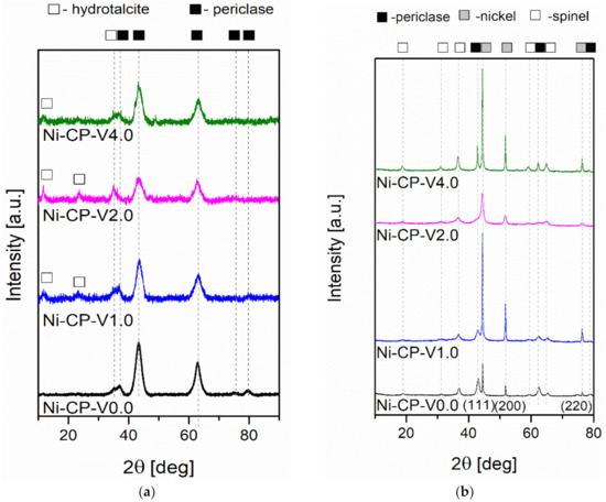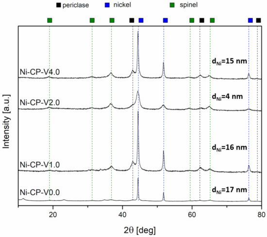 On reduced catalysts, three phases were distinguished from X-ray diffractograms, such as periclase (ICDD 00-045-0946) already discussed in Figure 4a, spinel (ICDD 01-070-5187), and metallic nickel (ICDD 03-065-0380). The source of the emerging nickel phase was the reduction of nickel species present in the periclase-like structure and a such crystalline phase was confirmed with three sharp and narrow reflections at 2θ of 44.3 (111), 51.7 (200), 76.1 (220), typical for metallic nickel. Spinel-type oxide is usually formed at high-temperatures, below 900 °C, at which the reduction was carried out, the temperature was sufficiently high to form such structure. This phase was most likely formed from periclase-like oxide and the obtained spinel oxide was MgAl2O4, as confirmed by the reflections at 2θ of 19.0 deg (111), 31.3 deg (220), 36.8 deg (311), 44.8 deg (400), 59.3 deg (511), and 65.2 deg (440). Additionally, a certain difference in the intensity in the diffractograms of the samples was visible: Ni-CP-V0.0 and Ni-CP-V2.0 resulted in much lower intensity of the nickel-related reflections, suggesting a small nize of the nickel crystallites in the sample. For Ni-CP-V1.0 and Ni-CP-V4.0, the reflections assigned to nickel are very intense, narrow, and sharp, indicating a relatively large size of metal crystallites. After the reduction step, no additional peaks related to vanadium oxide or other vanadium species were detected. Additionally, there is no shift in the position of the reflexions characteristic to nickel, suggesting that the Ni-V solid solution is not formed.