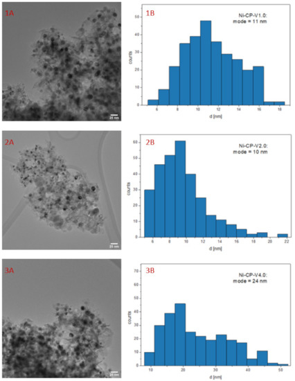 Figure 6 shows HRTEM images for Ni-CP-V0.0, (Figure 6(1A,1B)), Ni-CP-V1.0 (Figure 6(2A,2B), Ni-CP-V2.0 (Figure 6(3A,3B), and Ni-CP-V4.0 (Figure 6(4A,4B), with histograms (bin width calculated by the rice-estimator [44]) representing the distribution of nickel particle sizes. From Figure 6, one can conclude that the distribution of the nickel particles is uniform in all the hydrotalcite-derived samples.