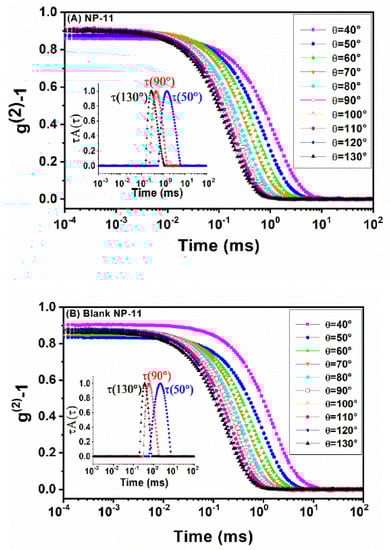 Multiangle light scattering measurements provide more robust, reproducible, and accurate data than single-angle analysis, particularly for multimodal samples, since they include autocorrelation functions for different scattering angles (θ) [38,39], and give a more accurate determination of the diffusion coefficient () [15]. Figure 2A,B shows the intensity autocorrelation function measured at multiangles () for NP-11 and blank NP-11, respectively, and the inset shows the relaxation-time distribution at scattering angles of 50°, 90°, and 130°. As can be seen, the relaxation time distribution curves are monomodal and a relatively narrow size distribution is observed, confirming the existence of only one population. Similar behavior on size distribution was observed at another scattering angle (results not shown here). Moreover, no peaks were observed at higher relaxation times, at other scattering angles, indicating good homogeneity of the MH-b-PS nanoparticles. The autocorrelation functions were fitted by employing the CONTIN method and relaxation frequencies ( were obtained for each scattering angle.
