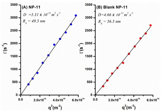 As shown in Figure 3, the relaxation mode for NP-11 and blank NP-11 is diffusive since a linear relationship between and square of wave vector modulus () (passing through the origin) was observed, which can be attributed to translational diffusion of the nanoparticles in the medium. The mean hydrodynamic radii () of the nanoparticles were calculated from the diffusion coefficient (), using the Stokes−Einstein relation. The resulting mean hydrodynamic diameters () were 99 and 113 nm for NP-11 and blank NP-11, respectively, indicating that the nanoparticles containing TMC display a smaller size but faster diffusion than drug-free nanoparticles.