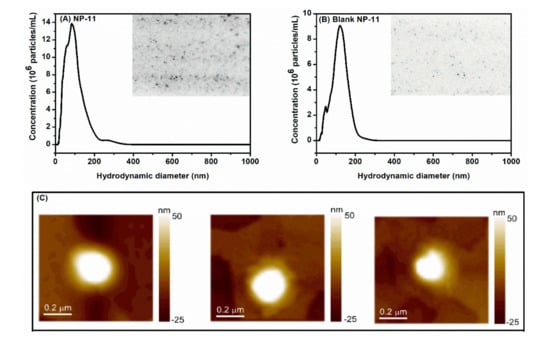 Size distribution for (A) NP-11 and (B) blank NP-11 from NTA measurements. Inserts show NTA video frames for both samples. (C) AFM images obtained for NP-11.