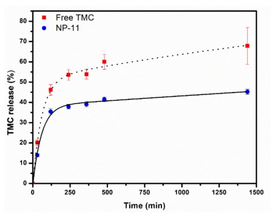In vitro release profile for free TMC and NP-11 using the dialysis bag method. The solid line corresponds to biexponential fitting for NP-11 and the dotted line is solely a guide in respect to free TMC.