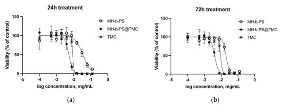 Cytotoxicity for blank MH-b-PS nanoparticles (empty circle), MH-b-PS@TMC (full circle), and TMC solution (cross) on the MCF-7 cell line, as estimated by MTT assay (a) after 24 h or (b) 72 h of incubation.