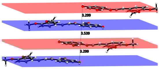 Shifted ring stacking interactions between molecules of DHDM. The intermolecular distances alternate between 3.299 and 3.539 Å.