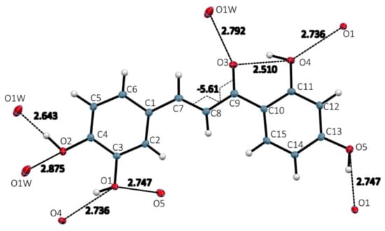 Atomic labeling, hydrogen bond distances surrounding single molecule and torsion angle in the molecular structure of Butein monohydrate. Three of four OH-groups, O2-H4, O1-H3, O4-H11 have two H-bonds. Hydroxyl O5-H13 has only one H-bond. Torsion angle C7-C8-C9-O3 is −5.61°. Ellipsoids represent 50% anisotropic displacement parameters.