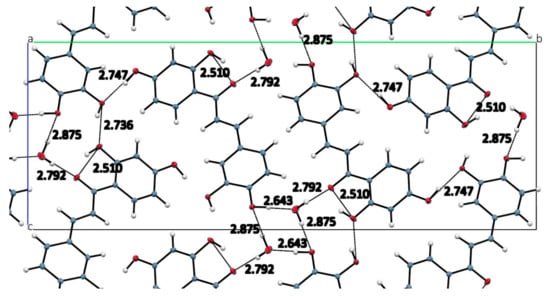 The structural analysis of DHDM shown in Figure 2, crystal data details in Table 1, revealed a mostly planar molecule [largest torsion angle C7-C8-C9-O5 is 16.3(2)°] that engages in limited intramolecular and intermolecular hydrogen bonding, intermolecular ring stacking. Figure 3 shows the ring stacking that occurs between molecules of DHDM. Figure 4 illustrates the intramolecular O6-H11…O5 2.538 (1) Å and the one intermolecular O7-H13…O5 2.714 (1) Å H-bond occurring among molecules of DHDM. There is a methoxy methyl-H/π hydrogen bond with distance C16-H161…centroid phenyl plane 2.747(1) Å. The effect of weak CH/π interactions in the molecular assembly can be seen in Figure 4 and their role in crystal structure assembly is recognized [32,33,34].