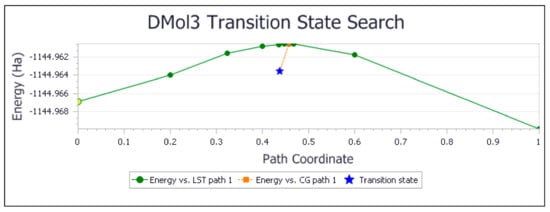 The molecule of Butein was modified using an option in DMOL3 and the resulting geometry of Homobutein, having a methoxy group in position 3 instead of the hydroxyl, was geometrically minimized with DFT and shown in Figure 15. Then, H4(Homobutein) and O(superoxide) were placed at van der Waals separation (2.60 Å) and the geometry optimization shows O(superoxide)–H4 interaction of 1.581 Å, Figure 16 left. As the potential product (formation of O2H plus Homobutein semiquinone) has lower energy than that the reactant, a transition state (TS) was submitted, resulting in the feasible scavenging of superoxide, with ΔG of −1.9 kcal/mol and E(barrier) of 2.1 kcal/mol, Figure 16 and Figure 17. The TS was characterized by a unique imaginary frequency.