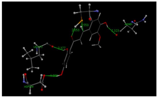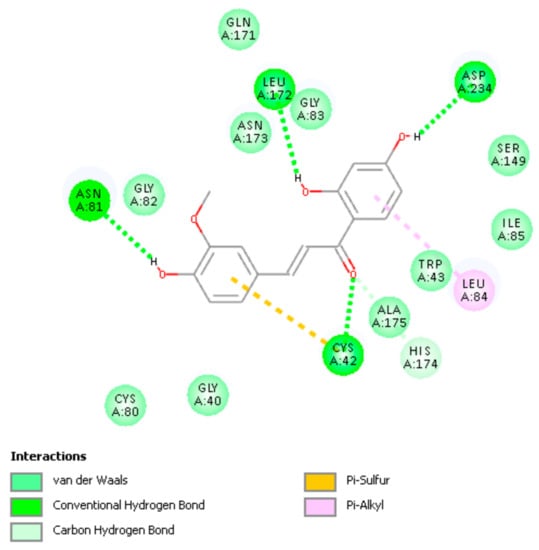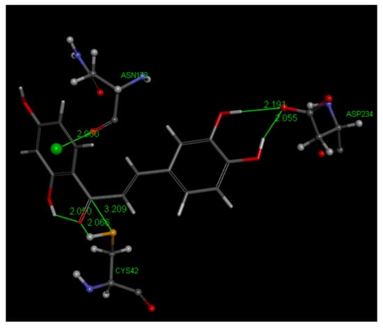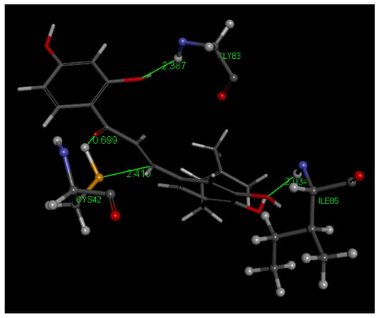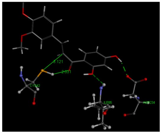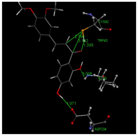 Three-dimensional (3D) interaction of Homobutein (3) with the receptor 3BPF Falcipain-2, pose 6. Compared to Butein, S(Cys42) shows a greater separation to the chalcone, 3.559 Å to the ethenyl β carbon. Three amino acids give stability to this arrangement through H bonds. O(carbonyl) shows a H-bond to H[S(Cys42)], 2.053 Å. Upon calculating binding energy (−16.7 kcal/mol) the arrangement is confirmed, showing S—C(β ethelnyl) separation of 3.400 Å, while O(carbonyl)—H[S(Cys42)] distance becomes longer, 2.458 Å. After minimization H bonds between Homobutein and amino acids Asn81, Leu172 and Asp234 show shorter lengths, 2.183 Å, 2.344 Å and 1.792 Å, respectively. The H atom bound to the ethenyl β carbon (shown in ball style) seems to hinder the approach of S(Cys42) and so no covalent bond seems feasible for Homobutein.