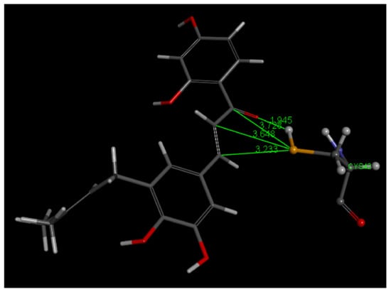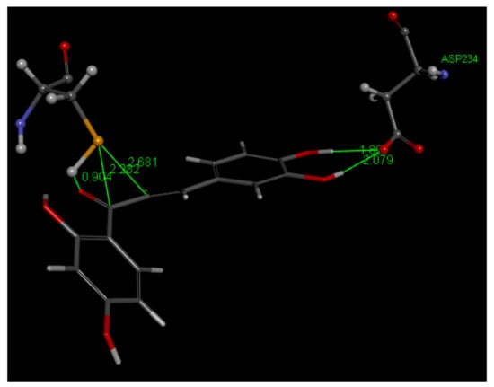 On the other hand, it is of interest that our computational results show that the strong intramolecular H bond between O(carbonyl) and H(2′-hydroxyl) that is always present in 2′OH-chalcones related crystal structures [15], appears broken for the biologically active 5-Prenylbutein, when interacting with the falcipain-2 active site, Figure 26. This is a strong indicator of potential covalent bond formation between S(Cys42) and the C(carbonyl) and, interestingly, Butein also has strong associated indicators envisaging its potential related covalent affinity at the active site though C(carbonyl).