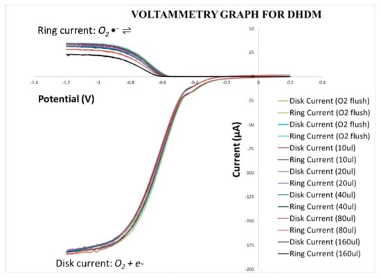 In summary, 7 runs were performed in the RRDE experiment to determine the antioxidant activity with 10, 20, 40, 80 and 160 of DHDM. For Butein, 8 runs were performed, from 10 to 160 μL (plus an additional 320 μL).
