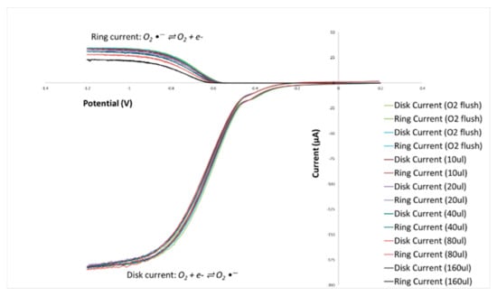 For the RRDE experiments in this project, the disk potential was swept from 0.2 V to −1.2 V which was negative enough to generate superoxide radicals. Then, while keeping the ring potential at −0.25 V, the disk potential was swept back to 0.2 V which was positive enough to oxidize the superoxide radicals to dioxygen.