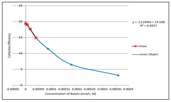 The collection efficiencies at increasing concentrations of DHDM and Butein were graphed (Figure 31 and Figure 32 respectively). Figure 31 demonstrated that as the concentration of DHDM increased in the electrolytic solution, there was a decrease in the collection efficiency, represented by the linear relationship (R2 = 0.9886) between both variables. Thus, the rate at which superoxide radicals decreased in the period between its production at the disk and its subsequent oxidation at the ring increased as more DHDM was added to the electrolytic solution, suggesting that DHDM was contributing to the scavenging of the superoxide radicals. Figure 32 demonstrated the same trend with scavenging of superoxide radicals by increasing concentrations of Butein occurring at a more rapid rate than DHDM, as depicted by the higher slope of the curve (−11.2 × 104 for Butein compared to −8.0 × 104 for DHDM). The antioxidant capability of both chalcones for scavenging the superoxide radical, using the same protocol, is in between quercetin (−15.4 × 104) and embelin (−6.0 × 104) [37].
