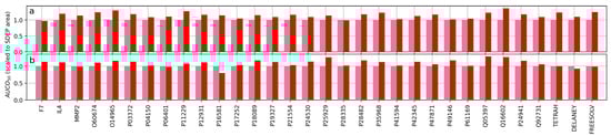 Comparison of the two UMs by . All values were divided by the of the SDEP to show relative areas. The height of each bar indicates the area between ideal curve and that of the measure (smaller is better). Bars corresponding to the SDEP are shown in gray, while bars of HVLs are colored red. The results are shown for all datasets (a) when using RDKit descriptors and (b) when using ECFPs.