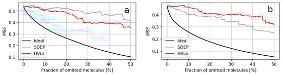 In all cases, the decreased when removing uncertain predictions according to each measure. For a random measure with no correlation to prediction uncertainty, the is expected to remain constant on average. Therefore, both UMs were considered to be effective in the detection of uncertain predictions. For the datasets and the evaluation strategy at hand, the SDEP outperformed HVLs in most cases, although their performances did turn out to be comparable. Despite the predictive quality of the examined model or its degree of overfitting, the decline in error could be considered similar for both UMs. Especially in cases where both measures showed similar performances, variations in the selection of train and test splits might change the ranking. The results would also differ when the standard deviation threshold was tuned as a hyperparameter. In this case, it also had to be decided how to tune the threshold, i.e., which objective function to use for this optimization step. would be a natural choice, but the for a given fraction of the predictions could also be used.