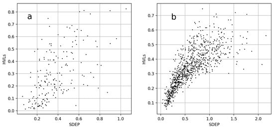 To a certain degree, the fraction of HVLs and the SDEP were correlated in all cases, which was expected, since both measures were effectively able to eliminate uncertain predictions. The absence of a correlation could only be expected from a random measure unrelated to prediction errors. Furthermore, HVLs detect local variations, i.e., output variability in similar regions of the independent variables. The SDEP is based on the variation of the predictions across the trees. In many cases, local variation in the leaves can induce mean shifts of the predictions. Thus, in these cases, both measures can yield similar uncertainties. Yet, cases are conceivable where homogeneous leaves in different trees can still disagree in their predictions, which can go unnoticed by HVLs, but can be detected by the SDEP. This might be the reason why the SDEP performed slightly better. This line of reasoning showed an advantage of the SDEP and underlined its value as the default UM in regression RFs.