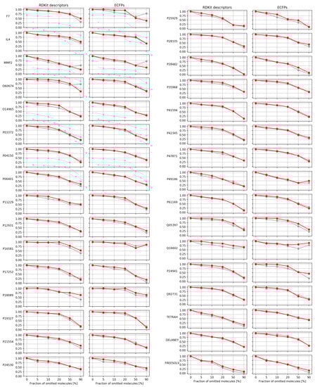 By removing more and more unreliable predictions, each remaining should be smaller than the previous . For almost all observed cases and the choice of fraction size at each step, such a relation could be observed. Occasionally, the removal of larger fractions resulted in a larger , at least between individual steps. Of those cases where the was larger than the , three were also among models of least predictive performance. MMP2 and O60674, when using RDKit descriptors, and Q05397 when using ECFPs, were within the top four worst predictive models of each descriptor. On the one hand, it seems plausible that the success of a UM can be linked to the predictive quality of the model. It appears odd that ensemble members that highly disagree can be correct in their aggregated prediction. On the other hand, ensemble predictors benefit from the diversity of their members [23]. The random variable selection in RFs is actually a feature to induce member diversity since, depending on the dataset, a diverse set of predictions can still lead to an accurate single prediction. Exemplarily, Q16602, when applying ECFPs, also exhibited a rise in from 50% to 90%, but was actually among the best performing models. It is, therefore, hardly generalizable to estimate the UM performance from the predictive performance.