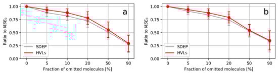 Averaging over all results provided a more general view in contrast to considering the outcome of only some individual datasets. On average, the general decline in and the observation that SDEP s were below the s of HVLs became clearer. Furthermore, by also including the standard deviation of the fraction-specific s across all datasets, the overlap between both performances became visible, despite the fact that the SDEP outperformed HVLs. Variation between s was more distinct when removing larger fractions, observable from the larger standard deviations for the s, s, and s in contrast to those of the s and s. In conclusion, the reduction in was similar for the most uncertain predictions, while the efficiency in error reduction in more certain predictions was rather case-dependent.