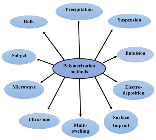 MIPs are selective sorbents to extract a target molecule in a similar approach of a “lock-and-key” or antibody-to-antigen mechanism found in the natural biorecognition. The MIPs synthesis consists of a template, monomer(s), and cross-linking agent in presence of a porogen (solvent) responsible for the distribution of the specific binding cavities “described in other simpler word as pores [8]”. The selection of the polymerization method is very important factor, as it depends on size and formats of desired MIPs besides its nature and thermal stability. Today, there are many methods for the polymerization of MIPs, as summarized in Figure 1.