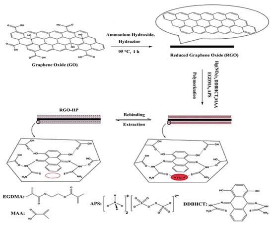 A novel Hg(II) electrochemical sensor, based on a reduced graphene oxide (RGO) surface imprinted modified glassy carbon electrode (GCE) using methacrylic acid (MAA) as the functional monomer, ethylene glycol dimethacrylate (EGDMA) as the cross-linker, 2,2′–((9E,10E)–1,4–dihydroxyanthracene–9,10–diylidene)bis(hydrazine–1 carbothioaide) (DDBHCT) as the chelating agent, and ammonium persulfate (APS) as initiator, is shown in Figure 3. The accumulation of Hg(II) ions at the surface of a modified glassy carbon electrode was used for tracing the Hg content electrochemically within a range of 0.07 to 80 μg L−1. The limit of detection (LOD) was found to be 0.02 μg L−1 (S/N = 3), which lies below the guideline value from the World Health Organization (WHO) [46].