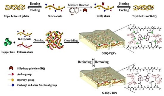 Schematic illustration of the preparation process for gelatin-hydroxyquinoline-Chitosan/ion-imprinted polymers for copper ions [52]. (Reproduced under permission from Elsevier, doi:10.1016/j.jcis.2019.01.081).