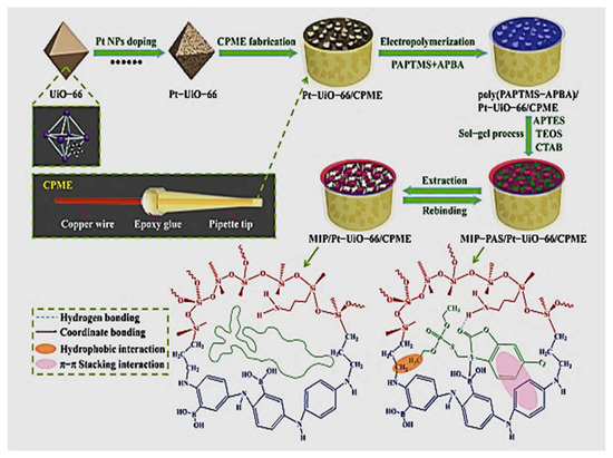In recent years, substantial attention has been paid to the application of MIPs in the field of chemical sensors. The MIP-based sensors are designed to be used for the detection of some pollutants, such as pesticides [30], pathogens, explosives, heavy metals [31], dyes, purification of chemical and biological reagent substances [32], industrial materials, and environmental pollutants analysis [33]. MIP-based sensors for different fields, such as clinical, bioanalytical [34,35], process control, and environmental applications, represent other possible promising applications.