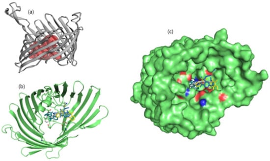 (a) Illustration of predicted protein pocket. (b,c) The best compounds are shown in the pocket of OmpU, as well as in a surface view depiction.