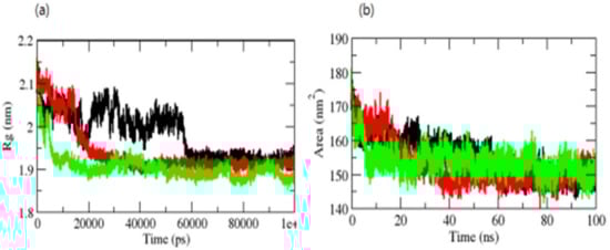 Rg (a) and SASA of complexes (b). The OmpU-control compound, OmpU-ZINC95910434, and OmpU-ZINC06494587 are shown in black, red, and green color, respectively.