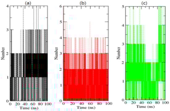 H-bonding amongst proteins and chemicals enables interaction directionality and specificity, which is a crucial element of molecular recognition [39]. To confirm the stability of complexes, the H-bonds paired within 0.35 nm between the OmpU-control compound, OmpU-ZINC95910434, and OmpU-ZINC06494587 were calculated during the 100 ns simulations. ZINC95910434 and ZINC06494587 were found to strongly bind to the AP of OmpU with three–four H-bonds, while the control compound bound to the AP of OmpU with one–two H-bonds, with the least fluctuations (Figure 8).