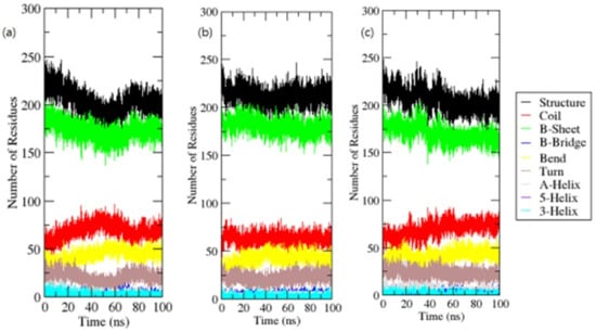 For each time step, secondary structural assignments in proteins such as helix, sheet, and turn were fragmented into particular residues. In contrast to OmpU, the average number of residues involved in secondary structure formation in complexes was somewhat reduced due to an increase in the proportion of coils and a decrease in sheets. In the instance of OmpU-ZINC06494587, the proportions of sheets and helices were found to be significantly lower (Figure 9).