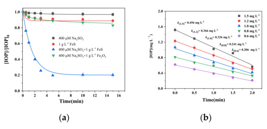 The effects of the FeS dosage on IOP degradation were investigated next by adding 0.4, 1.0, 1.6, 2.0, and 2.4 g L−1 of FeS to 400 μmol L−1 sulfite. The results, shown in Figure 4b, indicate that the initial reaction rate in the first 2 min increased with the Fe dose, which confirmed the catalytical effects of Fe(II) on S(IV). However, the total degradation efficiencies of IOP in 15 min were not fitted with that tendency of in first 2 min. As shown in Figure 4a, the efficiency of IOP degradation increased as the FeS dose was raised from 0.4 to 1.0 g L−1, and decreased about 10% with the increase in the FeS dose from 1.0 g L−1 to 2.0 g L−1. Further, at a FeS dose of 2.4 g L−1, only 63% of IOP was degraded. This indicates that FeS plays a significant catalytic role, producing SO4•−, while excess FeS can scavenge SO4•−, as shown in reaction (11) [48]. This finding is consistent with the reported strong interaction between SO4•− and Fe2+ ions where excessive Fe(II) acts as a sulfate-free radical scavenger in solution [49].