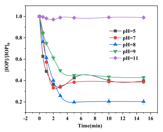 Effects of pH on the degradation of IOP by FeS/sulfite system. Conditions: [IOP]0 = 1.5 mg L −1, [FeS]0 = 1 g L −1, [Na2SO3]0 = 400 μmo L −1.