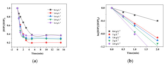 Results in Figure 2a also show a two-stage kinetic curve, including a fast stage in which about 75% of IOP could be degraded in the first 2 min and a slow one thereafter. This curve is a typical degradation kinetics curve that exists for degradation via autoxidation of sulfite, and it was also observed in our previous studies [44]. This curve is considered as being caused by the fast consumption of sulfite and DO [45]. In the fast stage (first 2 min), the concentration of sulfite and DO is relatively high, which leads to the production of a higher amount of the oxysulfur species. Then, DO and sulfite concentrations drop sharply, and the concentrations of the reactive radical species decrease, which retard the degradation of IOP. The initial IOP degradation rate increased with the initial IOP concentration, which followed the pseudo-first-order kinetics shown in Figure 2b,c.