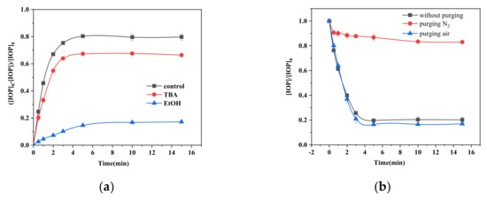 As shown in reaction (5), the process of generating SO5•− by oxidation of SO3•− is an important step in the production of SO4•− using the present system. DO should be one of the significant factors influencing the degradation of IOP. In order to exclude DO from the present system, the reaction solution was purged with nitrogen to eliminate DO. Figure 5b shows that in the case of nitrogen purging, there was no significant change in the IOP concentration. For 15 min of reaction time, the IOP degradation rate was only 11%, which indicates that the effects from SO3•− are weak since SO5•− cannot be generated from SO3•− without DO. However, when the present system was purged with air, approximately 83% of the IOP was degraded in 15 min. This small enhancement can be attributed to the increased DO concentration leading to the formation of a larger amount of SO5•−, and subsequently, of a larger amount of SO4•−.
