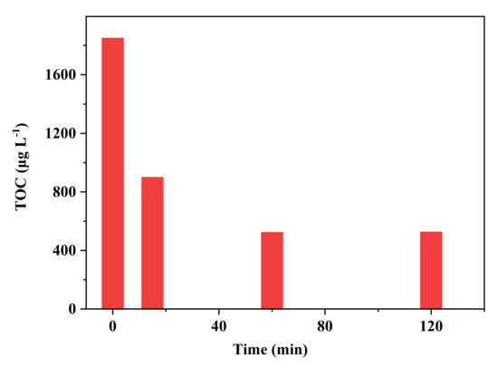 According to the above discussion, the efficiency of mineralization is an important factor for the removal of IOP. In the current system, the removal of TOC was evaluated, which is shown in Figure 6. The TOC reduction achieved 51.4% after 15 min; it then reached 71.8% after 1 h and tended to remain stable thereafter. Chan et al. reported near-complete mineralization of IOP using the UV/peroxydisulfate system after approximately 70–80 min [14], which proves the applicability of SR-AOPs for the mineralization of IOP.