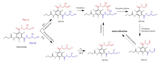 Three primary degradation products (DPs) formed by IOP degradation were identified by LC-MS. All DPs and their fragments, determined from mass spectra, are presented in Table S1 and Figure S7, and these are denoted as DP789 (empirical formula C18H22I3N3O8), DP760 (empirical formula C17H20I3N3O7), and DP728 (empirical formula C16H16O6N3I3) based on their own molecular weight. The fragments of DPs are consistent with those found from photoinduced transformation [57] or electrochemical treatment [5] of IOP. There are two similar glycol structures at the end parts of IOP, namely part A and part B as shown in Figure 7, which are most likely to be oxidized, initiating the degradation of IOP. Further, DP789 is formed by the loss of two hydrogens from IOP, which could be formed by the oxidation of the terminal hydroxyl group to the aldehyde or the oxidation of the central hydroxyl group of the molecular chain to the keto moieties at the molecular chain containing the hydroxyl group at both ends [57]. Regardless of which parts are the first to be oxidized, the products, including DP760 and DP728, indicate that both of the glycol structures are finally oxidized to the aldehyde group and form DP728. The above-mentioned oxidation process could be formed by either HO• or SO4•−. HO• is preferred to process abstraction of H atoms from the α-H and hydroxyl group, as IOP continually forms aldehyde derivatives or keto moieties derivatives, while SO4•− is usually preferred to process electron transformation. However, some organic compounds with less electron-rich groups can also be decomposed by SO4•− through the process of H-abstraction [58]. The oxidation process of IOP is very likely initiated through H-abstraction by SO4•− since α-carbon is vulnerable to the attack by SO4•−. The carbon-centered radicals could be formed during the H-abstraction process and could be then rapidly converted to peroxide radicals through oxygen addition. Subsequently, hydroperoxide radicals (HO2•−) are eliminated from the formed peroxide radicals [59] to give aldehyde derivatives or keto moieties, and these are subsequently oxidized into aldehyde derivatives such as DP728.