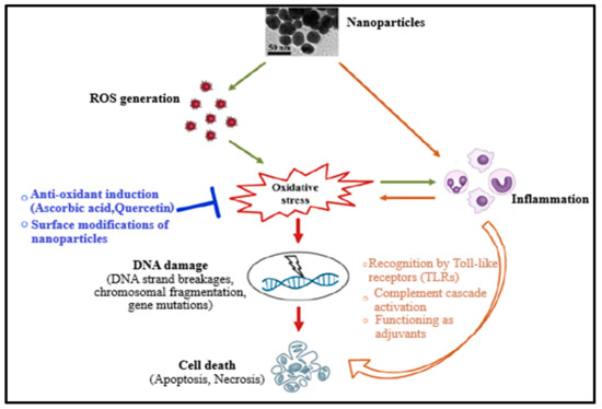 Up to date, the mechanism of nanomaterial toxicity has not yet been clearly defined due to the inconsistency of nanotoxicity data obtained. However, based on the results already published, it has been reported that NMs can cause reactive oxygen species (ROS) production either directly or indirectly during toxicity or cytotoxicity, leading to oxidative stress (Figure 1). This could be due to the existence of pro-oxidant functional groups on their reactive surfaces or NM–cell interactions [2,11,12,13]. Oxidative stress can cause damage of DNA (which includes induction of gene mutations, DNA strand breakages, and chromosomal fragmentation) and subsequently apoptosis. NMs (or nanoparticles) have also been reported to induce inflammation, resulting in toxicity and promoting cell death by inducing toxic by-products like complement proteins and ROS or receptor-induced necrosis/apoptosis (Figure 1) [2,10,12,13,14]. Furthermore, oxidative stress may provoke the release of pro-inflammatory mediators through phosphoinositide 3-kinase (PI3-K) pathways, mitogen-activated protein kinase (MAPK), and nuclear factor-κB (NF-κB), indicating a mutual correlation between oxidative stress and inflammation. Therefore, the damage caused by nanoparticles to the cell is cytotoxic and genotoxic [2,10,12].