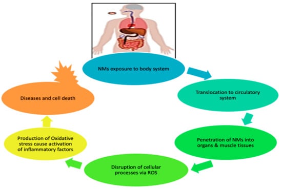 Figure 2 further illustrates the pathway taken by NMs on exposure to the human body. The NMs are capable of penetrating the pulmonary system, gastrointestinal tract, and skin barriers, and then translocating to the circulatory system, where they are distributed to muscle tissues and organs (heart, brain, lung, kidney, liver); they disrupt cellular processes via ROS production, leading to oxidative stress. These processes later cause activation of inflammation, triggering the disease and cell death [5].