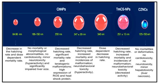 Younes and co-workers revealed that ChZNCs may be moderately toxic against the liver, while zebrafish embryos treated with a ChZNCs concentration of 25–200 mg/L did not produce any major effect on the neurological behavior or deformities of the embryos. ChZNCs-treated embryos also showed normal heartbeat functions [81]. The organ-specific toxicity of ChNPs was also investigated in zebrafish embryos by Abou-Saleh et al. [82]. They demonstrated that high concentrations of ChNPs might be toxic against zebrafish embryos as abnormal hyperactivity and significant impairment of the liver size compared to the negative control were observed [82]. In contrast, zebrafish embryos treated with a low concentration of ChNPs displayed normal heart physiology and functional activity. Abou-Saleh and co-workers also used small sizes of ChNPs (100–150 nm), and no toxic effect or teratogenic phenotypes were depicted [82]. The same results were obtained even when a high concentration (200 mg/L) of ChNPs was used. Similarly, Wang et al. also demonstrated that 200 mg/L of ChNPs with a smaller size (84.86 nm) did not induce major mortality in the treated embryos [83].