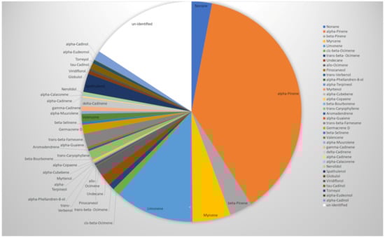 α-Pinene (Figure 2) was the most abundant compound (37.8%), followed by limonene (11.6%) (Figure 3), myrcene (5.6%) (Figure 4), β-pinene (3.4%) (Figure 5), and nonane (3%) (Figure 6). It is noteworthy that α-pinene was also the major compound of the previously studied H. scabrum essential oils from the following different regions of the world: Iran [19], Turkey [20], Tajikistan [21], and Uzbekistan [22]. This does not apply to the other major compounds, which were sometimes minorly present or even totally absent in these other samples.