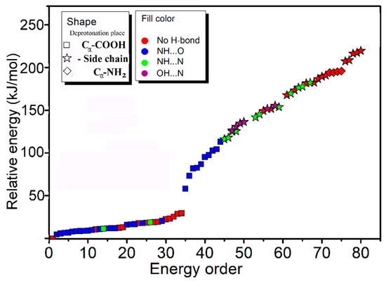 Obviously, some bands in the experimental spectrum, such as the absorption at 3565 cm−1 and the band in the region 3020–3200 cm−1, cannot be explained by these low-energy isomers. Even considering all the top 30 isomers (Figure S4), their predicted spectra are all absent in these characteristics. Thus, the experimentally generated ions should include some isomers with different structures. Considering that the observed peak at 3565 cm−1 is from the vibrations of free carboxylic OH vibrations [30,31,32], there must exist isomers with the group of -COOH. This is very unexpected, since all previous experimental and calculational proofs clearly indicated that Arg is very likely to form zwitterionic structures when interacted with metal ions, or other molecules in the gas phase [33,34,35,36]. A further check on the calculated isomers of [Arg+Rb+K−H]+ (Figure 2 and Table S1) also shows that the isomers including the -COOH group are typically 125–250 kJ/mol higher in energy than the most stable isomer of 1a.