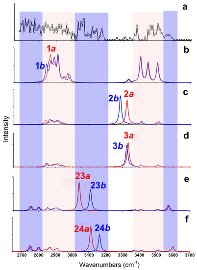 As shown in Figure 4, the calculated IR spectra of 1a and 1b (based on B3LYP/6-311++G(d,p)~LAN) are very similar to each other. The predicted band in the region of 3350–3550 cm−1 (from NH stretches) corresponds to experimental results well (Restricted by the S/N ratios of the experimental spectrum, a quantitative description of the frequencies and relative intensities of IR vibrations in such complexes was not performed here [28,29].) For the experimentally observed broad band 2680–3000 cm−1, the predicted spectra only show strong and weak absorptions in two regions of 2820–2930 cm−1 and 2930–3000 cm−1 (both from CH stretches). On the other hand, the calculated IR spectra of 2a/2b and 3a/3b are similar, but poorly agree with the experimental results in the region 3250–3350 cm−1. All those spectra show strong absorption at ~3300 cm−1 coming from the vibrations of hydrogen bound NH bond, which are obviously absent in the experimental spectrum. The calculated IR spectra based on the methods of B3LYP/def2-TZVP and MP2/6-311++G(d,p)~SDD show similar results. The results obtained by the MP2 method are shown in Figure S3.