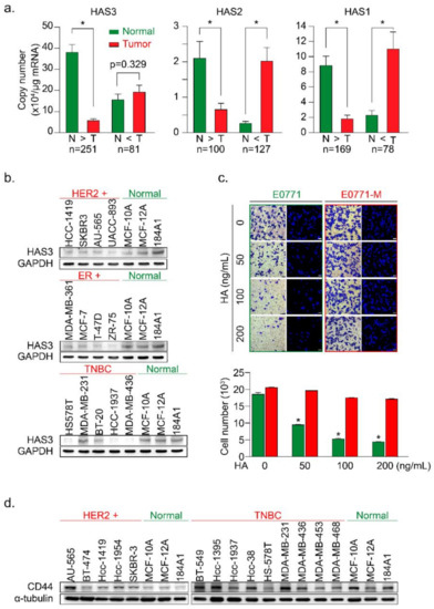 The HAS3 protein was preferentially overexpressed in normal breast epithelial cell lines and adjacent normal tissues surrounding the breast tumor. (a) The HAS family (HAS1, 2, and 3) mRNA expression profiles of paired human breast tumor (red bars) and normal (green bars) tissues were determined by real-time PCR. Copy numbers (× 104 per μg of mRNA) were calculated from mean real-time PCR data; error bars indicate 95% confidence intervals. Data were analyzed with a paired t-test, and the presented p-values are two-sided. Normal tissue (N) vs. tumor tissue (T) in each group. * p < 0.0001; (b) The protein expression of HAS3 in 13 breast cancer and three normal breast epithelial cell lines was detected by immunoblotting. The protein expression of GAPDH is shown as a protein loading control; (c) A Transwell assay was conducted to test the HA-induced anti-migratory effects. HA (0–200 ng/mL) was added in the lower chamber coculture with the syngeneic mouse breast cancer (E0771, green bars) and lung-metastatic E0771 (E0771-M, red bars) cancer cells in the upper chamber. The data shown indicate the number of migrated mouse (E0771 vs. E0771-M) breast cancer cells. Error bars indicate 95% confidence intervals. Data were analyzed with a paired t-test, and the presented p-values are two-sided. * p < 0.05 compared with the control group; Magnification, 630×; scale bar, 200 μm. (d) The protein expression of CD44 in 14 breast cancer cell lines and three normal breast epithelial cell lines was detected by immunoblotting. The protein expression of α-tubulin is shown as a protein loading control.
